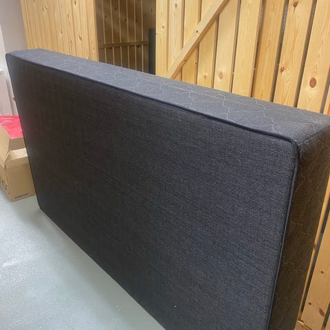 Kuvassa runkopatja hassusti, jalkopääty sängynpäädyn päässä. Runkopatjan toinen pääty (jalkopääty) samanlaista harmaata verhoilua kuin runko. Runkopatja viisivyöhykejousituksella.