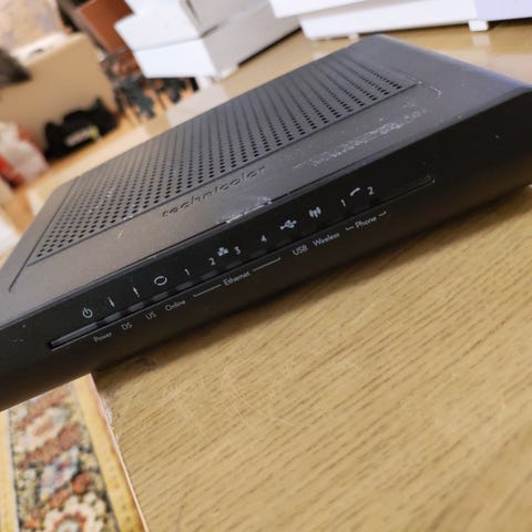 Technicolor modeemi kiinteään verkkoyhteyteen. Laitteessa on etupaneelissa merkkivalot yhteyden ja toimintojen seurantaan sekä painike WPS-toiminnolle. Pohjassa on tyyppi- ja sarjanumerot sekä muut tunnistetiedot, kuten MAC-osoitteet. Modeemi soveltuu internetyhteyden jakamiseen kotiverkossa. Tarkemmat tekniset tiedot, kuten malli, liitännät ja tuetut yhteystyypit, löytyvät laitteen pohjassa olevasta tarrasta tai valmistajan dokumentaatiosta.