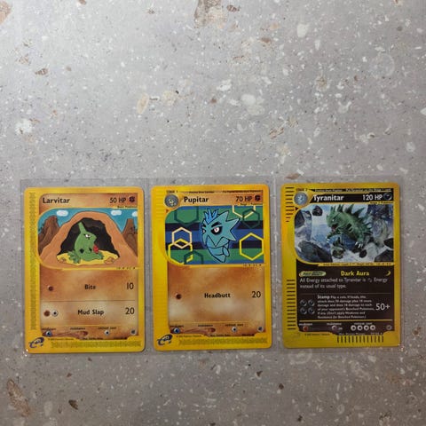 Myydään hyvässä kunnossa olevat Tyranitar 30/100 ja 26/95 Pokemon kortit.