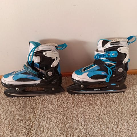 Kätevät lapsen jalan mukana kasvavat luistimet. Säätöalue on 34-37. Luistimet on ns. hokkarit eli niillä voi harjoitella jääkiekkotyylisen luistelun. Luistimet on hyvässä kunnossa ja niiden mukana tulee avaamaton luistinsuojapaketti.