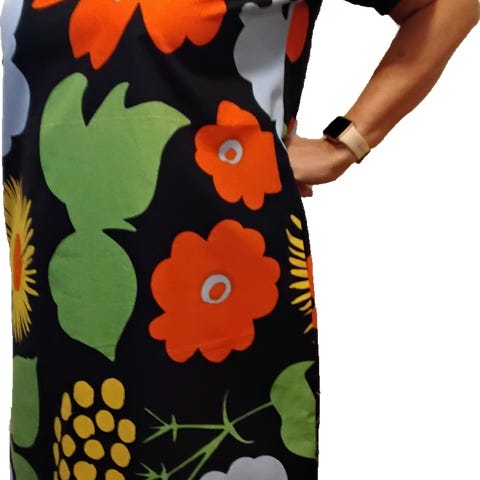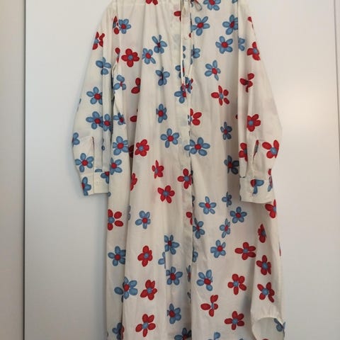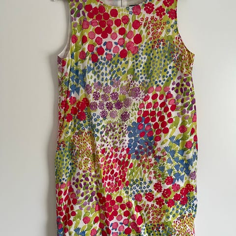 Marimekon varjoinen pilvipuutarha mekko, valmistettu viskoosikrepistä. Niskassa pieni halkio jossa nappi pukemista helpottamaan. Mekossa pitkät hihat.