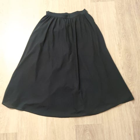 Kokolappu puuttuu, mutta vastannee kokoa 38. Leveä ja jämäkkä vyötärö kuminauha, leveys venyttämättä sisäpuolelta mitattuna noin 34 cm eli vyötärön ympärys noin 68 cm. Hameen pituus noin 90 cm. Ei valitettavasti mahtunut itselleni.