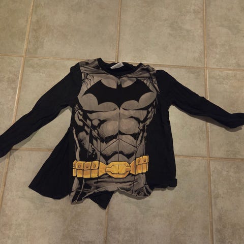 Viitallinen Batman-naamiaisasu seuraavalle leikkijälle. Tarralla olkapäihin kiinnitettävä viitta ja kuminauhallinen maski.