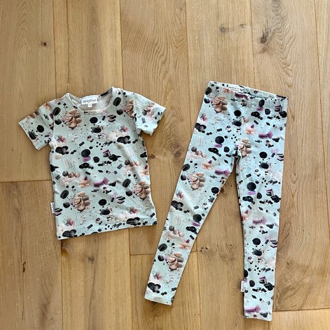 Kuin uusi Gugguu frillapaita, heppa kuosi. Pidetty paristi, pieni langan nousu. Koko 104. Uudet Gugguu leggingsit. Eläimetön ja tuoksuton koti.