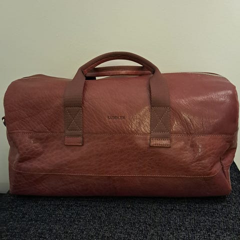 Etelän reissun impulssiostos, joka ei sitten koskaan tullutkaan käyttöön. Mutta tästä nyt hieno täysnahkainen iso kassi miehelle, joka kulkee omia polkujaan tai rempseälle reissunaiselle. On tosiaan käyttämätön, mutta kotona heti huomasin, että yhden ulkosivutaskun vetskari on vähän hajalla, ks.. viim. kuva. On myös painunut vähän lyttyyn vuosien mittaisessa säilytyksessä, mutta eiköhän sen jollain oikenemaan saa. Vain nouto