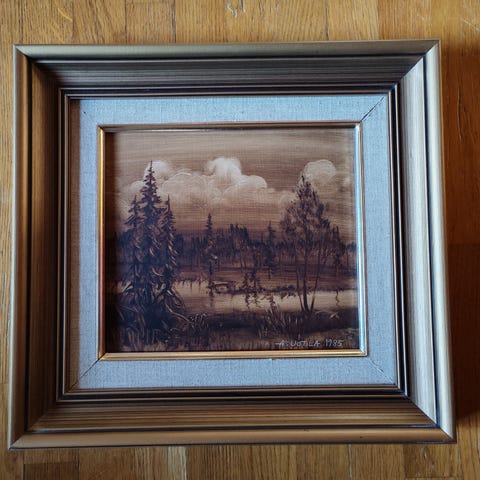 Myydään Aulis Uotilan ruskeasävyinen, kaunis luontoaiheinen maalaus vuodelta 1985. Hyvässä kunnossa. Myynnissä myös toinen samantyyppinen A. Uotilan maalaus, yksittäin 40€, yhteishinta 75€.