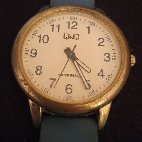 Lähes käyttämätön naisten rannekello, ei tuotemerkkiä. Kellotaulu punaisen metalliheijasteinen. Kromi rungossa lieviä naarmuja ja hihnan vasemmalla kärjessä väri kuluma. Kello käy ajassa nykyisellä paristolla toistaiseksi.