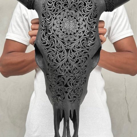 EI VARAUKSEN HINTA - Upea suuri valkoinen kaiverrettu härän kallo -