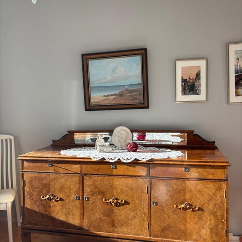 Myydään alunperin musta, mutta valkoiseksi maalattu senkki. Voi olla, että alkuperäinen väri ollut jotain muuta kuin musta. Käsittelemällä tästä saisi varmasti vielä upean näköisen. Laikkua sisäseinässä, en tiedä mistä tullut. Suoraan käytöstä, on painava ja vanha. Vain nouto.