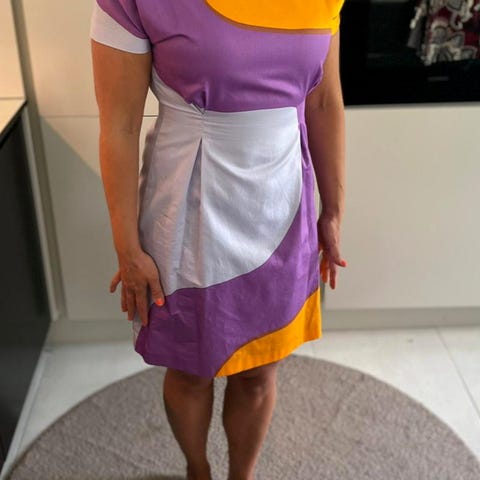 Marimekko naisten mekko, koko 42. Mekossa on monivärinen kuosi vihreän, turkoosin ja tumman violetin sävyissä. Materiaali on päällisen osalta 100 % puuvillaa. Vuori on.