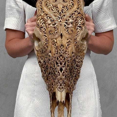 Suuri käsin kaiverrettu härän pää, jonka ovat kaivertaneet taiteilijat, jotka ovat siirtäneet muinaisen kaiverrustaidon isältä pojalle.Kallo on kokonaan käsin veistetty suurella huolella. Se on epätavallinen koriste-esine.Kaiverrettu on kaunis Big Lotus -motivi.Arvioidut mitatKorkeus: 58 cmLeveys: 59 cmHUOM:Olemme lisänneet kuvia käsityöläisistämme työssään antaaksemme kuvan siitä, millainen prosessi on kaiverratetun pään luominen.Paino, joka mainitaan, sisältää pakkausmateriaalin.VastuuvapauslausekePäähän on kiinnitetty kiristysnarusta, jotta se voidaan kiinnittää seinälle.- Sarvet irrotetaan kuljetusta varten, ja ne on helppo kiinnittää takaisin. Sarvet ovat aina pakattuna laatikon pohjalle, kallon alle. Varmista, että poistat sarvet ennen pakkauksen hävittämistä.- Koska kyseessä on luonnollinen kallo, siinä saattaa olla joitakin luonnollisia pieniä halkeamia, uurteita tai puuttuvia hampaita. Tämä on normaalia. Katso kuvat viitteeksi.- Kallomme puhdistetaan ammattilaisvoimin, mutta joskus hampaissa voi esiintyä pieniä värimuutoksia. Tämä on luonnollista ja normaalia, eikä siihen voida paljoa vaikuttaa. Katso kuvat ohjeiden tueksi.LähetysKohde lähetetään seurantanumerolla DHL Parcelin, DPD:n tai postNlin kautta. Seuranta päivittyy Catawiki-luettelossasi, kun pakettisi on jätetty postiin.Ole hyvä ja tarkista säännöllisesti välttääksesi pakettisi palautumisen meille, jolloin ostaja vastaa toisen lähetyksen toimituskuluista.Seurantaan Espanjaan ja Portugaliin käytä tätä linkkiä ja lisää Catawiki-erästäsi saatu seurantanumero.https://clientesparcel.dhl.es/LiveTracking/HomeME EMME YHDISTÄ TOIMITUKSIA!!!Jos sinulla on kysyttävää paketistasi, ota meihin yhteyttä Catawiki-viestipalvelun kautta. Pyrimme vastaamaan kolmessa työpäivässä.