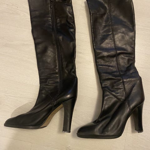 Suomessa tehdyt Mantere Broadwayn hyväkuntoiset saappaat. Nahkaa, villakangasvuori. Varren korkeus n 50cm, eli ylettävät n polvitaipeeseen. Koko 38, sanoisin itse enemmän 37 ja 38 väliltä. Ei vetoketjua, mutta takana jonkunsorttiset venykkeet ja sujahtavat siten hyvin jalkaan. Varren ympärysmitta ylhäältä n 40cm.