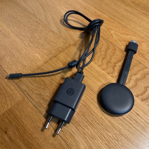 Toimiva Chromecast. Liitetään televisioon, jossa on HDMI-liitäntä. Toimii myös vanhoissa televisiossa, joista tämä liitäntä löytyy. Lisäksi tarvitsee toimiakseen Google Home-sovelluksen. Tällä saa jaettua mm. netflixiä omasta puhelimesta ja jaettua kännykän näyttöä ruudulle.