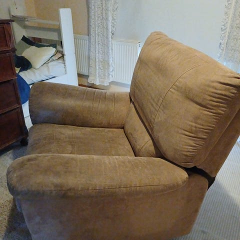 Harmaa kangas. Istuin- ja selkäpehmusteet vaahtomuovia. Jalat massiivitammea. L66 x K84 x S68 cm.