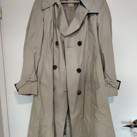 Valmistettu puuvillasta/polyesterista. Takissa on kaulus, etutaskut ja takahalkio. Hihansuissa on nappikiinnitteiset tampit. Kuvissa näkyy käytön jälkiä ja pieniä kulumia kankaassa. Sopii käytettäväksi välikausitakkina arkeen ja siistimpään pukeutumiseen.
