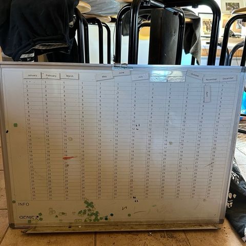 Noin A4 kokoinen ilmoitustaulu tussilla. Taulussa on pieni hakanen, joten sen saa ripustettua seinälle tai sitä voi pitää pöydällä. Puolet valkotaulua ja puolet korkkia. Haku Turku 20540.