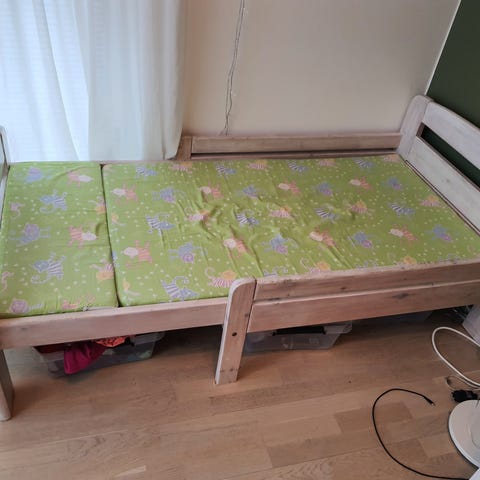 Annetaan jatkettava lasten sänky. Ollut käytössä 8 vuotta. Sänky on naarmuinen, siinä on kulumajälkiä, auringon kellastama ja varmaan joku kynäpiirroskin löytyy. Kuitenkin edelleen toimiva.