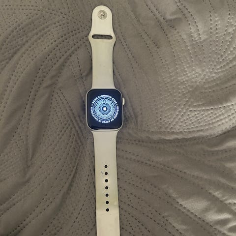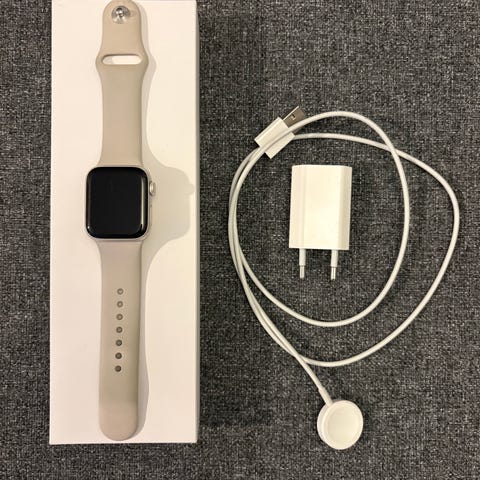 Apple Watch älykello valkoisella silikonirannekkeella ja laturi. Kellossa on suorakulmainen kosketusnäyttö ja useita säätöreikiä rannekkeen koon mukauttamiseen. Sopii ranteeseen, jossa tarvitaan säädettävää pituutta. Älykello soveltuu ajan ja ilmoitusten seurantaan sekä yhteensopivien Apple-laitteiden kanssa käytettäväksi.