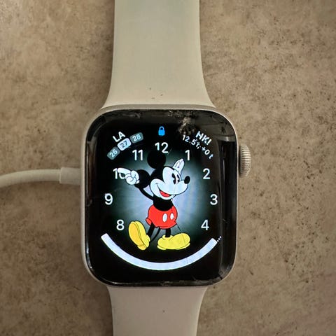 Näytössä on pieni naarmu ja rannekkeessa vägän tummaa. Voisi lähteä hankaamalla pois.