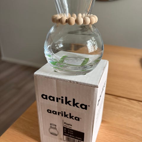 Aarikka Kupla-maljakko lasia, vaaleanpunainen. Pyöreä, pallomainen muoto ja leveä suuaukko. Suuaukon ympärillä on vaaleanpunaisista puuhelmistä koostuva koristeellinen kaulus, jossa pieni Aarikka-riipus. Sopii esimerkiksi leikkokukille, oksille tai sisustuselementiksi.