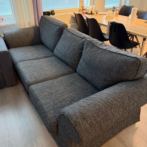 Myydään muuton tieltä harmaa 3-hengen sohva. Ryhdikäs, mutta päälliset kaipaa pesua.