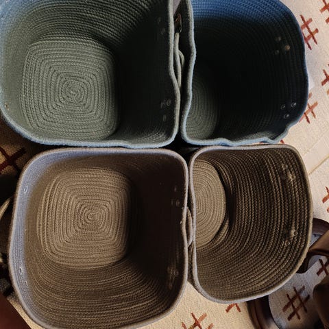 Kaksi valkoista säilytyskoria sinivihreällä kankaalla. Koko 25 x 30 x 30 ( korkeus, syvyys, leveys).