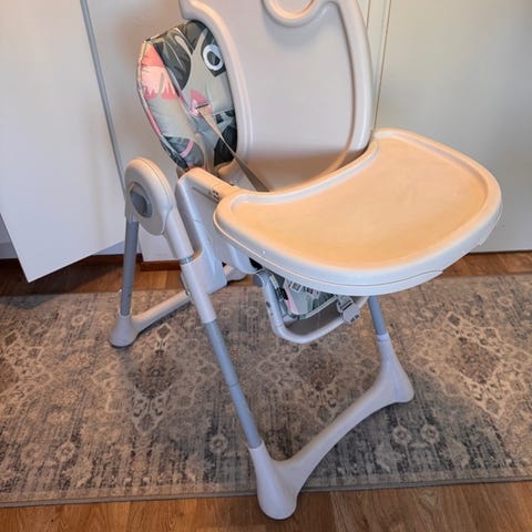 Myydään valkoinen syöttötuoli. Säädettävä juniorikokoon saakka. Tarjotin, valjaat ja turvakaari.