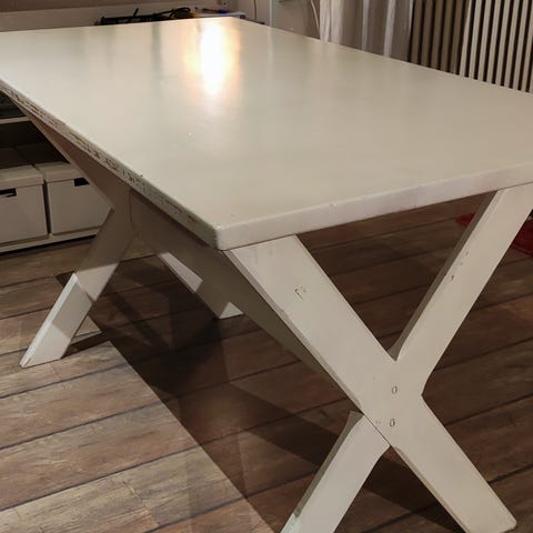 Annetaan kuvan mukainen ruokapöytä. Palvellut hyvin aikansa, mutta rajallisen tilan vuoksi parempi vaihtaa pienempää. Pöytälevyssä kolhuja jonkin verran, koitin saada kuviin näkymään. Jalustassa muutamia värjäytymiä. Pöytä painaa kohtalaisen paljon ja en tiedä saako sitä kuinka paljon purettuakaan, joten siihen on hyvä varautua. Lähtee ensimmäiselle noutajalle. Sijaitsee Caribian vieressä.