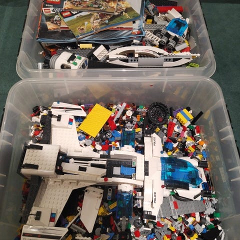 Kaikista ohjekirjat mukaan sekä kolme isoa Lego laatikkoa.
