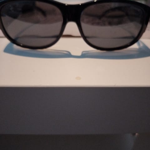 Polaroid aurinkolasit silmälasien päällä käytettävät. Kehykset ovat mustat (tai tosi tumman ruskeat) ja linssit ruskeat.