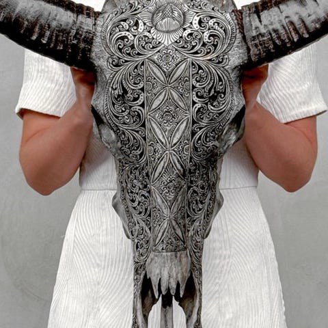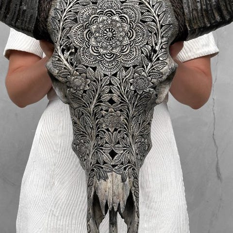Suuri vesipuhveli-kallo, joka on kaiverrettu käsin lahjakkaiden balilaismestareiden toimesta. Heidän isänsä ovat siirtäneet ikivanhan kaiverrustaidon pojilleen. Tämä kallo on täysin avattu kaiverruksella. Kaiverrus on poikkeuksellisen korkealaatuista.Kaiverrettu kalloon on kaunis Ganesha-motiivi.Noinmiten mitatPituus: 70 cmLeveys: 73 cmHUOM:Olemme lisänneet kuvia käsityöläisistämme työssään antaaksemme kuvan siitä, millainen prosessi on kaiverratetun pään luominen.Yksi tai useampi kuva tarjoaa tyylitellyn esityksen vastaavasta tuotteesta. Tarkkojen tietojen saamiseksi myytävästä tuotteesta viittaa muihin kuviin. Ei mitään tyylitellyssä valokuvassa ole mukana myynnissä.Paino, joka mainitaan, sisältää pakkausmateriaalin.VastuunrajoituksetKalloon on kiinnitetty kiristysnaru, jotta sen voi asentaa seinälle.- Kuljetusta varten sarvet irrotetaan, ja ne on helppo kiinnittää takaisin.Myös kallon yhteydessä on nyöri, jonka avulla sen voi kiinnittää seinälle.- Sarvet ovat aina laatikon pohjalla, kallon alla. Varmistathan, että poistat sarvet ennen pakkauksen hävittämistä.- Koska kyseessä on luonnollinen kallo, siinä saattaa olla joitakin luonnollisia pieniä halkeamia, uurteita tai puuttuvia hampaita. Tämä on normaalia. Katso kuvat viitteeksi.- Kallomme puhdistetaan ammattilaisvoimin, mutta joskus hampaissa voi esiintyä pieniä värimuutoksia. Tämä on luonnollista ja normaalia, eikä siihen voida paljoa vaikuttaa. Katso kuvat ohjeiden tueksi.LähetysKohde lähetetään seurantanumerolla DHL Parcelin, DPD:n tai postNlin kautta. Seuranta päivittyy Catawiki-luettelossasi, kun pakettisi on jätetty postiin.Ole hyvä ja tarkista säännöllisesti välttääksesi pakettisi palautumisen meille, jolloin ostaja vastaa toisen lähetyksen toimituskuluista.Seurantaan Espanjaan ja Portugaliin käytä tätä linkkiä ja lisää Catawiki-erästäsi saatu seurantanumero.https://clientesparcel.dhl.es/LiveTracking/HomeEMME YHDISTÄ TOIMITUKSIA!!!- Jos sinulla on kysyttävää paketistasi, ota yhteyttä meihin Catawiki-viestipalvelun kautta. Yritämme vastata kolmen työpäivän kuluessa.
