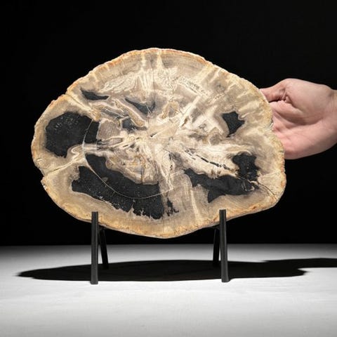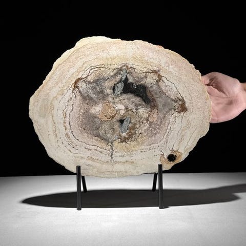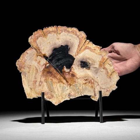 Upea pala petrifioitunutta puuta räätälöidyllä jalustalla.Kivettynyt puu on mineraalisoitunut kappale puusta, joka on muodostunut, koska puut kaatuivat ja peittyivät maaperän tai hiekan kerrokseen. Usein tämä tapahtuu luonnonkatastrofin seurauksena. Kivettyneen puun värit riippuvat maaperän tai hiekan mineraaleista. Jokainen mineraali luo oman värinsä. 'Kivettyminen'-prosessi varmistaa, että kaikki ominaisuudet, kuten solmut, kuori ja vuosirenkaat, säilyvät. Mahdollisesti hajoava prosessi kaukaisessa menneisyydessä voi johtaa upeisiin kristallimuodostelmiin, usein monivärisinä.Noin mitat jalustan kanssa:Korkeus: 25,2 cm - Leveys: 28,7 cm - Viipaleen paksuus: 1,8 cmNoin mitat ilman jalustaaKorkeus: 20 cm - Leveys: 28,7 cm - Viipaleen paksuus: 1,8 cmVastuuvapautukset:Ole hyvä ja huomaa, että yksi kuvista on otettu pimeässä studiolla, ja värit voivat vaihdella ympäristön mukaan.Paino, joka mainitaan, sisältää pakkausmateriaalin.LähetysKohde lähetetään seurantanumerolla DHL Parcelin, DPD:n tai postNlin kautta. Seuranta päivittyy Catawiki-luettelossasi, kun pakettisi on jätetty postiin.Ole hyvä ja tarkista säännöllisesti välttääksesi pakettisi palautumisen meille, jolloin ostaja vastaa toisen lähetyksen toimituskuluista.Seurantaan Espanjaan ja Portugaliin käytä tätä linkkiä ja lisää Catawiki-erästäsi saatu seurantanumero.https://clientesparcel.dhl.es/LiveTracking/HomeME EMME YHDISTÄ TOIMITUKSIA!!!Jos sinulla on kysyttävää paketistasi, ota meihin yhteyttä Catawiki-viestipalvelun kautta. Pyrimme vastaamaan kolmessa työpäivässä.