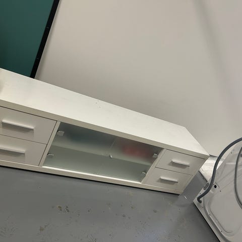 Ruskea ja lasinen tv taso renkailla. Perus ehjä