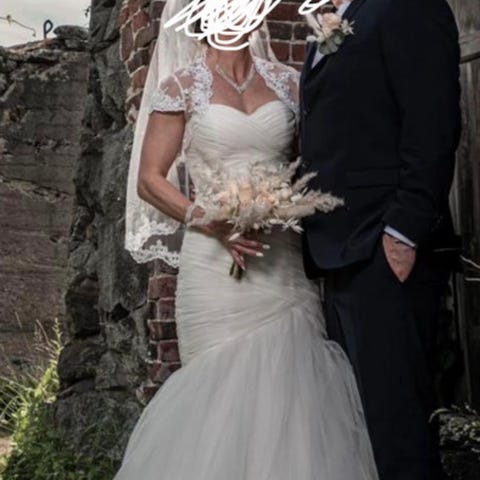 Upea A-linjainen häämekko, väri ivory. Mekossa lyhyehkö laahus, jossa pitsinen rannelenkki. Laadukas helmakangas kestävä, mutta kevyt kantaa. Yläosa kaunis pitsinen rintakupeilla. Selkä avoin. Mekon koko 36-40 vartalonmallista riippuen. Itse olen 175cm kokoa 38-40. Jalassa oli noin 8cm korot.