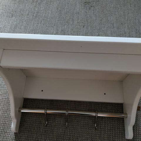 Hyvä kuntoinen vanha naulakko etsii uutta seinää itselleen. Naulakossa on hylly, tanko osuus henkareille sekä neljä liikuteltavaa koukkua.