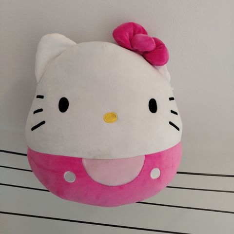 Hello Kitty tyyny, vaaleanpunainen. Tyyny on Hello Kitty -hahmon pään muotoinen, etupuolella painettu kasvokuva ja rusetti. Materiaali on pehmeää kangasta, taustapuoli yksivärinen. Sopii esimerkiksi lastenhuoneeseen tai koriste- ja leikkityynyksi. Tyyny on 2000-luvun alusta