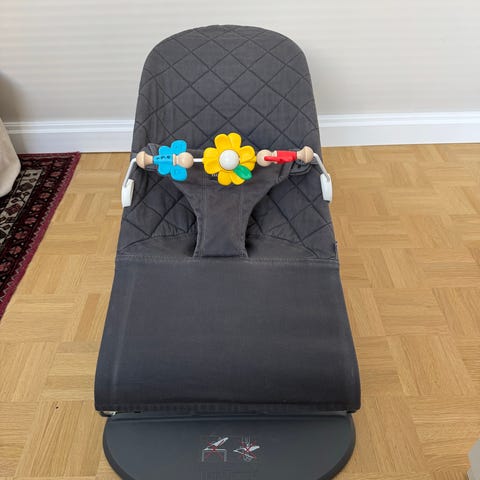 Babybjörn lasten tuoli, vaaleanpunainen kangasverhoilu ja leikkikaari.