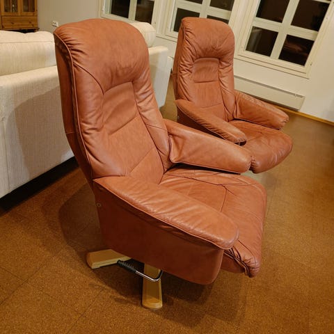 Ylimääräiseksi jäänyt nojatuoli seuraavalle tarvitsijalle. Nahka vaatii pesun mutta muuten täysin moitteettomassa kunnossa.