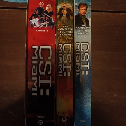 CSI ja CSI: Miami dvd-kokoelma. Mukana useita CSI: Miami -kausia bokseina sekä CSI: Crime Scene Investigation -sarjan levyjä, mm. kausi 3 levy 1 ja levy 2 sekä erikoisjakso, jonka on ohjannut Quentin Tarantino. 25e+post
