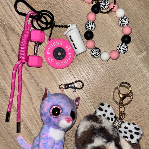 2 avaimenperä koristetta. Helminauha ja virkattu kettukoriste.
