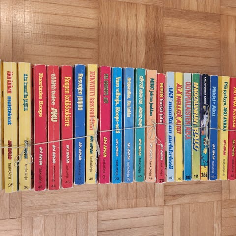 Hyväkuntoiset Aku Ankan vuosikerrat ja kaupan päälle taskukirjoja. Hinta yhteensä 45€- vanhat erikseen 35€.