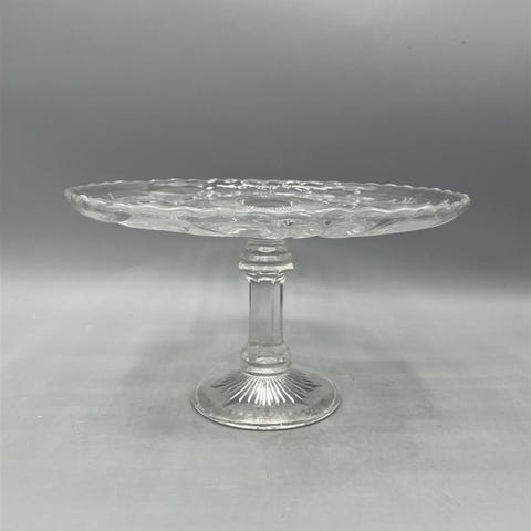 Sininen paksulasinen jalallinen tarjoiluvati, jossa on koristeellinen kuviointi.Vati on hyvässä kunnossa ilman näkyviä vaurioita.