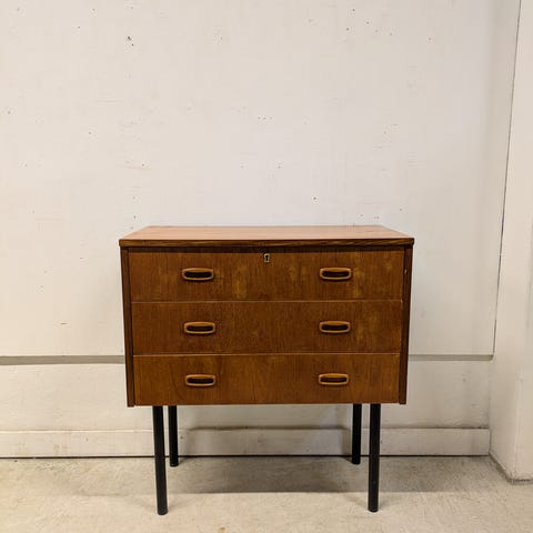 Tämä tiikki viilutettu kukkataso etsii uutta kotia. Runko ehjä ja tukeva. Muovikaukalo pois nostettava. Muutamia pieniä viiluvikoja ja kuprua kannessa.