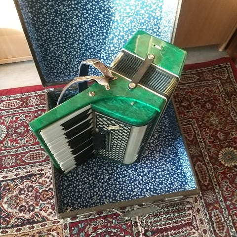 1970-luvun venäläinen harmonikka. Hyvä kunto, vähän soitettu. Väri tummanpunainen.