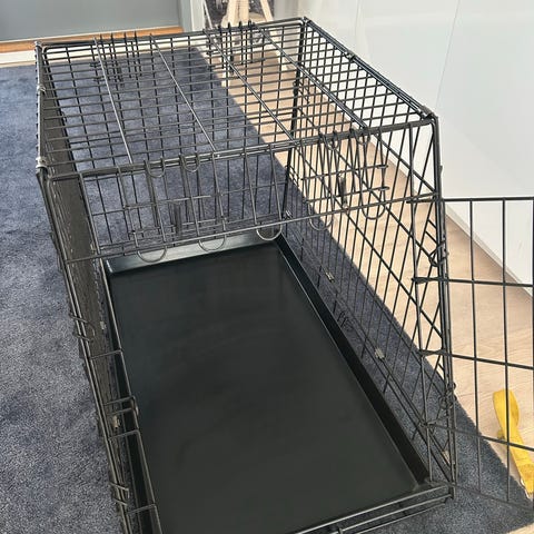 Sopii koiran kuljettamiseen ja tilapäiseen majoittamiseen esimerkiksi autossa, matkalla tai kotona. Väri harmaa ja musta, materiaali kangas ja verkko yhdistettynä kevyisiin tukirakenteisiin. Mitat: leveys 50 cm, korkeus 50 cm ja pituus 70 cm.