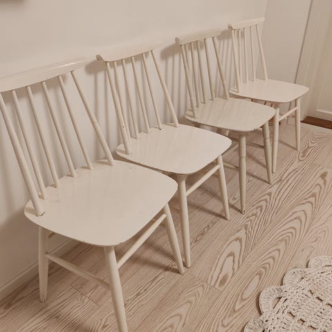 Nämä nätit retro pinnatuolit etsivät uutta kotia. Jokaisessa rungot tukevia. Maalissa kolhuja / jälkiä. Istuinkorkeus 43,5 cm. Myydään settinä.