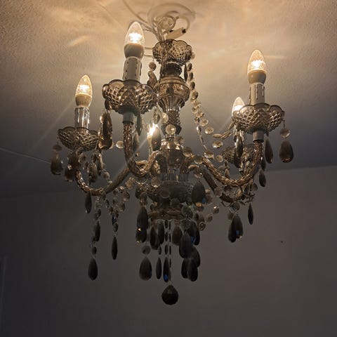 Viisihaarainen kattokruunu hopeanväristä metallia. Kuvut huurrelasia. E14-kantaiset polttimot sisätyvät hintaan. Askosta ostettu n. 25 vuotta sitten.