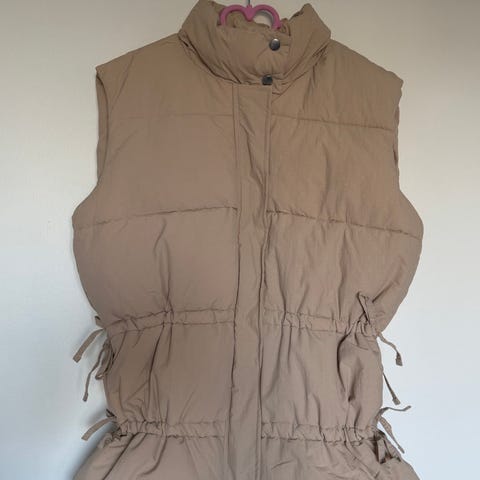 Valkoinen toppaliivi, jossa korkea neulos kaulus. Edessä vetoketju ja painonapit. Sivuilla vetoketjulliset taskut, povitasku vasemmalla puolella liivin sisällä.