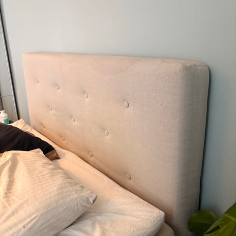 Myydään uuden tieltä harmaa, elämää nähnyt, mutta siisti ja ehjä sängynpääty 160cm.