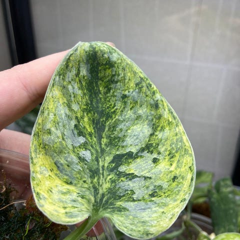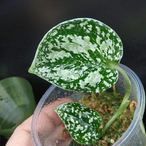 Erikoisempi, upea Scindapsus, hopeaköynnöslajike, Silver Dark Cloud. Juurtunut sammaleeseen ja kasvuun lähtenyt.